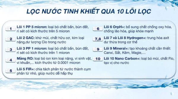 – Lõi 10 Nano Carbon+: loại bỏ mùi, chất Flo, tạo vị cho nước, ngăn chặn sự phát triển của vi khuẩn.