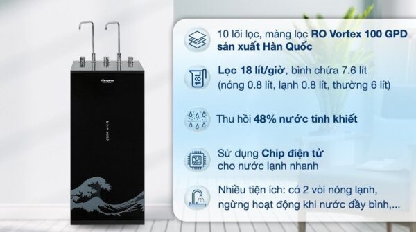 Máy lọc nước RO nóng lạnh Kangaroo KG10A12 10 lõi có 3 chế độ nước nóng – nguội – lạnh, màng lọc RO Vortex 100 GPD xuất xứ Hàn Quốc cho công suất lọc lớn, tạo nước Hydrogen chống oxy hóa, thương hiệu Kangaroo – Việt Nam.