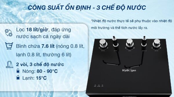 – Công suất lọc 18 lít/giờ, dung tích bình chứa 7.6 lít (nước nóng 0.8 lít, nước lạnh 0.8 lít, nước thường 6 lít) đáp ứng nhu cầu sử dụng nước hằng ngày của gia đình.