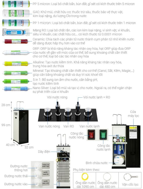 – Lõi Nano Silver (Sx Việt Nam): Loại bỏ mùi và tạo vị cho nước, ngăn chặn sự phát triển của vi khuẩn.